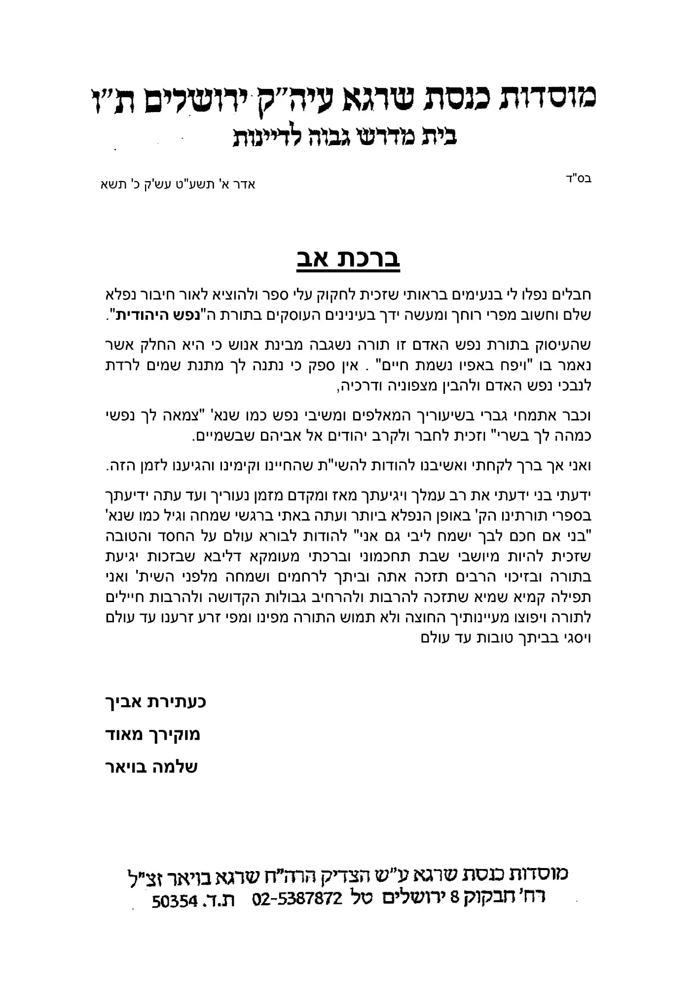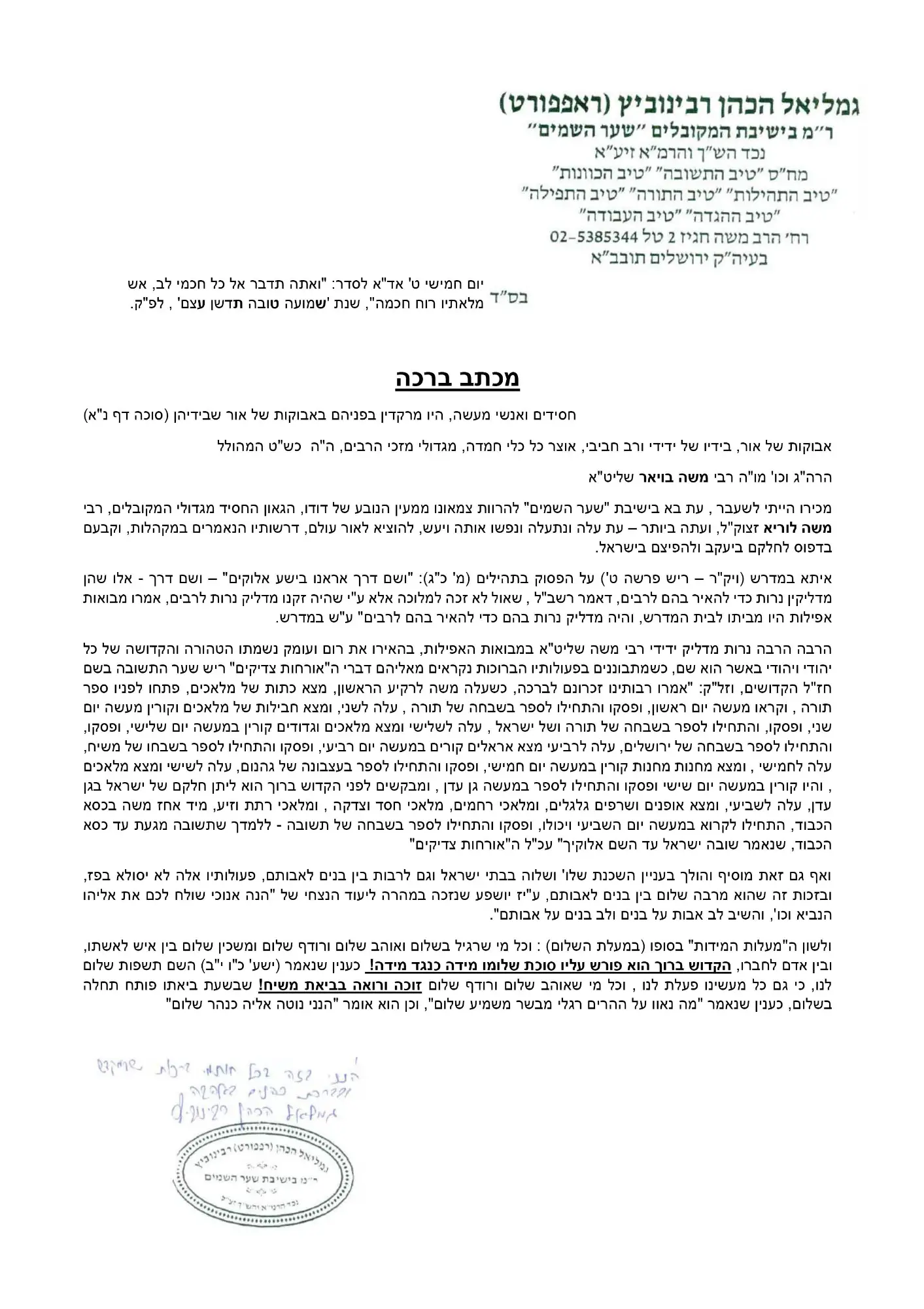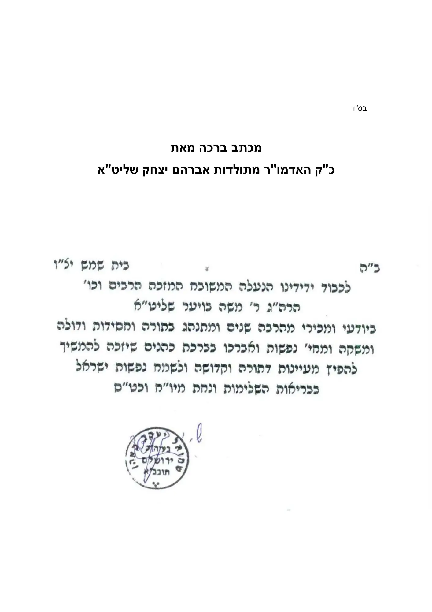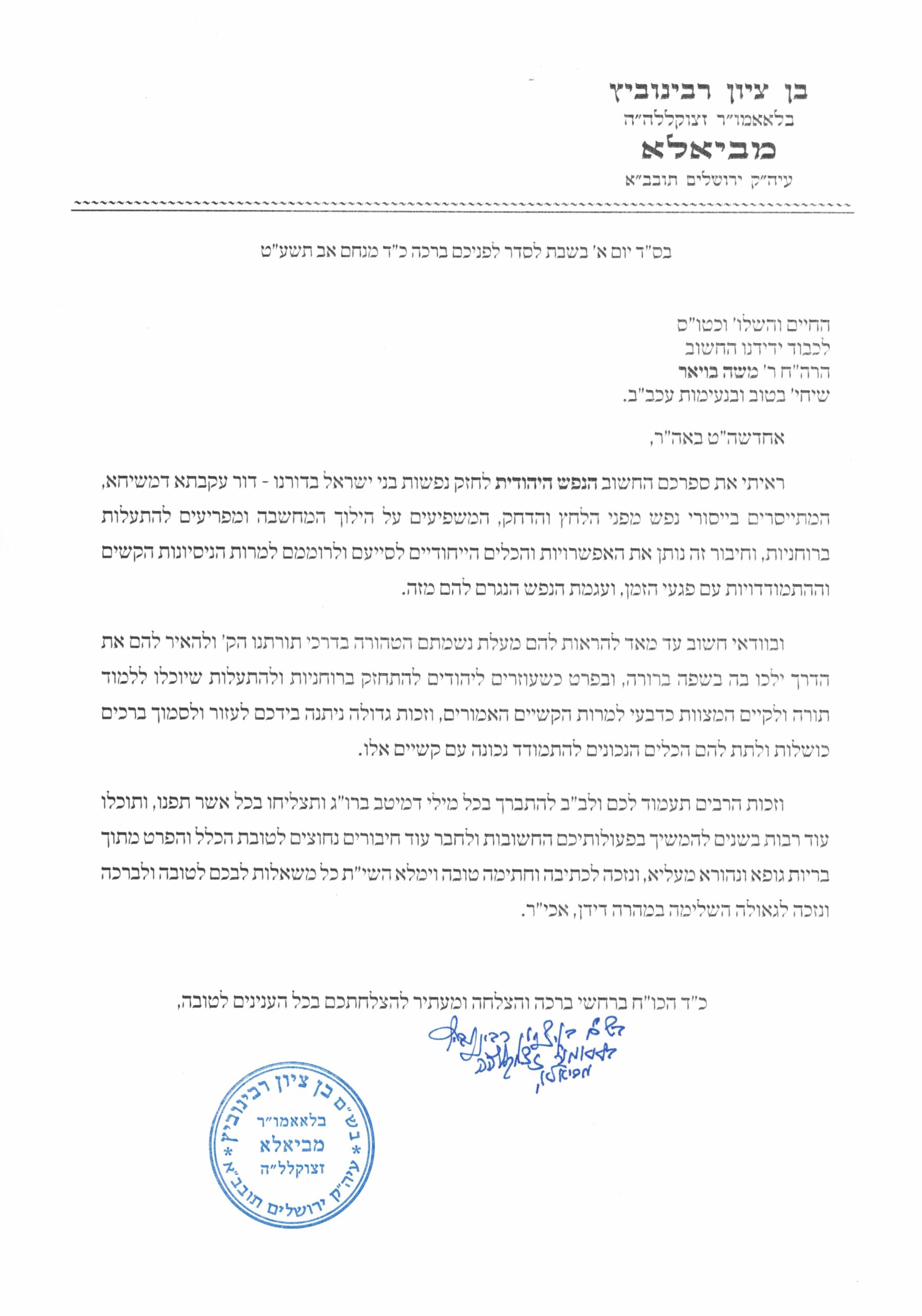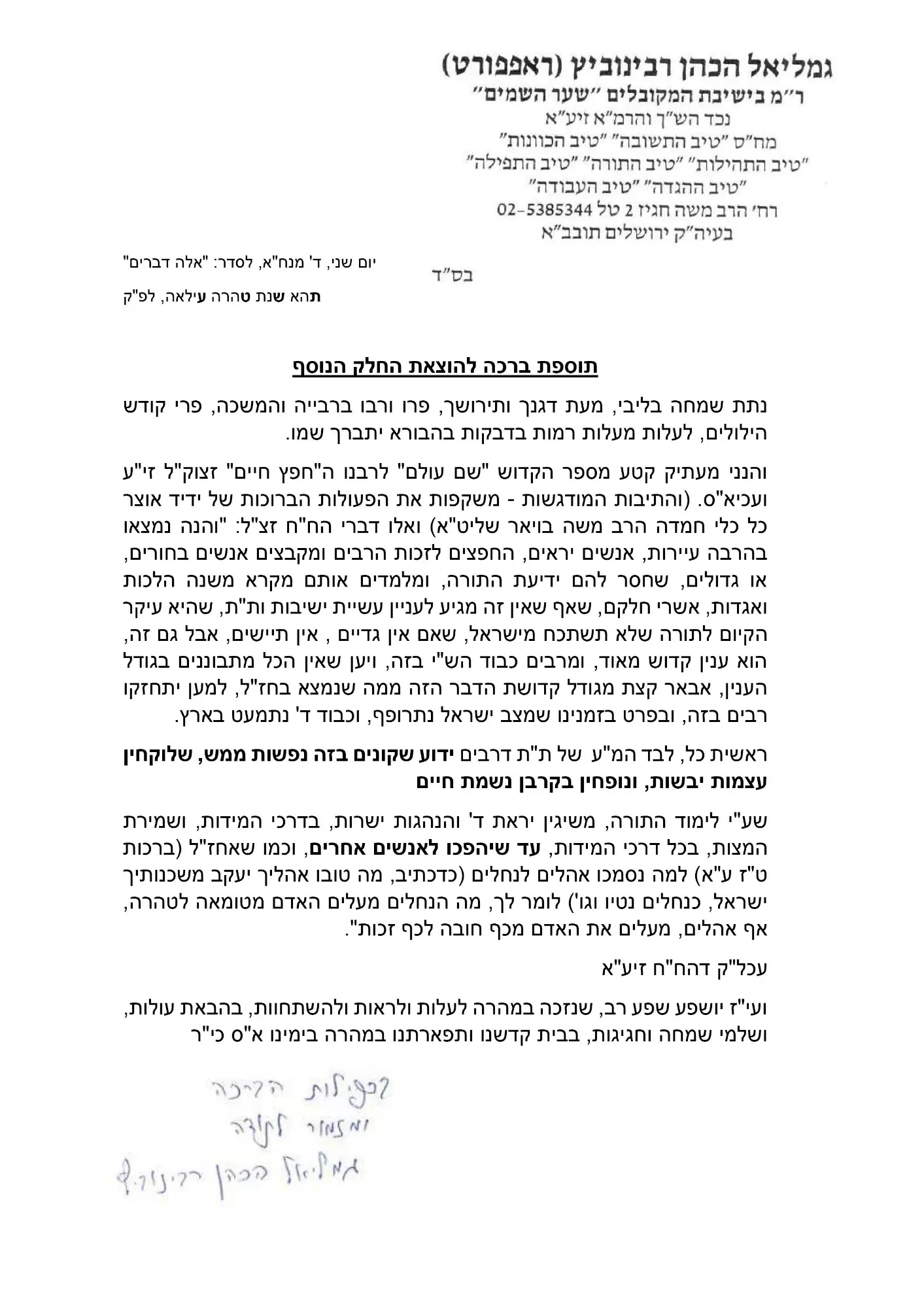 ייתן ה’ ויוסיף כוח ואומץ לרב ולבני ביתו וישיב לכן כגמולכם בנחת בצאצאים ובתלמידים וירחיב גבולות הקדושה.